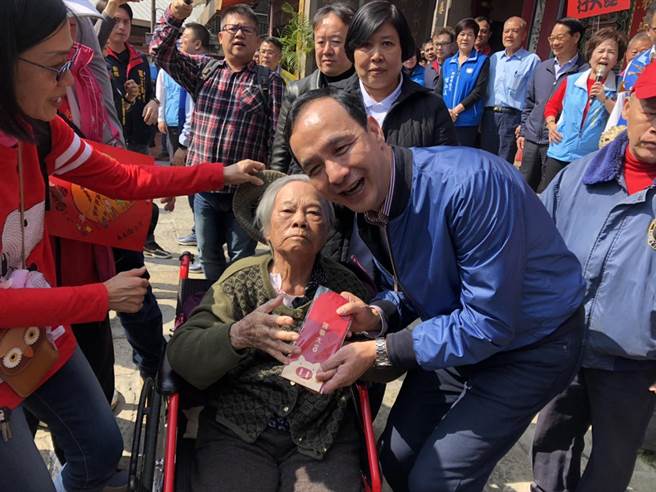 朱立倫2日到新竹市關帝廟上香祈福,并向民眾拜年同時發(fā)放紅包,現場數千支持民眾擠爆周遭道路。(圖片來源:臺灣“中時電子報”)