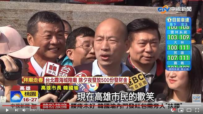 當選高雄市長的韓國瑜,如今不論任何行程,隨時都有熱情粉絲包圍爭取握手、合照,發紅包也都被秒殺。對比七個月前與國民黨主席吳敦義參拜時,身旁除了隨扈與同黨黨員,幾乎沒有任何支持者到場,和民眾合照時甚至直接被忽略,還要自己“找機會蹭進去”。歡迎廣告牌上也只有吳敦義的名字,“韓國瑜”三個字根本看不到。
