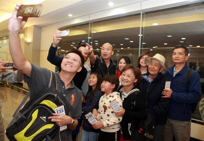 高雄市長(zhǎng)韓國(guó)瑜7日晚間返臺(tái),一下機(jī)就被熱情的民眾拉去合影。(圖片來(lái)源:臺(tái)灣“中時(shí)電子報(bào)”)