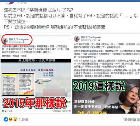 有網(wǎng)友在臉譜網(wǎng)不公開社團(tuán)“爆政公社”分享兩張蔡英文臉譜網(wǎng)截圖,一張是2015年華航機(jī)師醞釀罷工時(shí),蔡英文力挺,還喊“機(jī)師、空服員加油”,一張是2019年2月11日華航機(jī)師罷工進(jìn)入第4天時(shí),蔡英文遭質(zhì)疑神隱后首度談話,希望勞資雙方誠(chéng)心坐下來協(xié)商,創(chuàng)造三贏。該網(wǎng)友說,蔡英文這次怎么不說“華航機(jī)師加油”了呢?以前沒有臉譜網(wǎng),說過的話都可以不算,自從有了臉譜網(wǎng),說過的話就“……”以下開放填空,還說政客的話聽聽就好,腦殘護(hù)航的都很蠢。