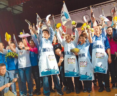 韓國瑜、侯友宜、盧秀燕為謝龍介站臺,要促銷臺灣農特產,希望幫臺灣的鄉親“拼經濟”。(圖片來源:臺灣“中時電子報”)