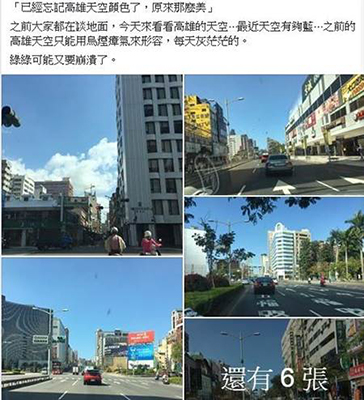 去年8月臺灣南部連日暴雨,高雄市道路出現5000個“天坑”,引發民怨。高雄市長韓國瑜上任后,市府努力鋪路,網友在臉譜網“韓國瑜后援會”接力發“路平”照片歡天喜地。還有網友在“韓國瑜后援會”連發數張“藍天”照片說,“已經忘記高雄天空顏色了,原來那么美”,之前大家都在談地面,今天來看看高雄的天空,最近天空有夠藍,之前的高雄天空只能用烏煙瘴氣來形容,每天灰茫茫的。該網友還笑說“綠綠可能又要崩潰了。”