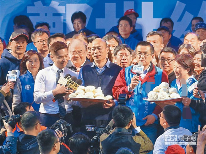 新北市三重“立委”補選國民黨參選人鄭世維(前排右二)23日造勢活動,高雄市長韓國瑜(前排右三)與臺中市長盧秀燕(前排右)合體送包子。(圖片來源:臺灣“中時電子報”)