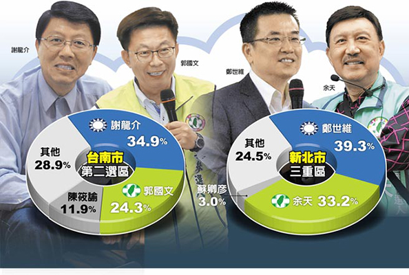 在臺南市部分,謝龍介本人知名度高,加上“韓流”加持,根據旺旺中時媒體集團最新民調顯示,謝龍介以34.9%支持度勝過民進黨候選人郭國文的24.3%,民進黨脫黨參選的陳筱諭則有11.9%,顯然綠營分裂也是導致郭國文陷入險境的原因。新北三重原也是“綠軍鐵票倉”,且民進黨候選人余天曾在三重當選過“立委”,本人知名度也高,但據民調顯示,鄭世維在韓國瑜幫忙造勢后,民調開始往上升,現以39.3%領先余天的33.2%。