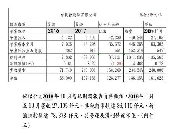 根據數據顯示,臺農發公司2016年營業收入473.2萬、2017年240.2萬、2018年1到10月2719.5萬;對照該公司的營業成本,2016年792萬、2017年4329.8萬、2018年1到10月6330.5萬。因此2016年虧損283.2萬、2017年虧3998.3萬、2018年1到10月虧損3556.3萬。