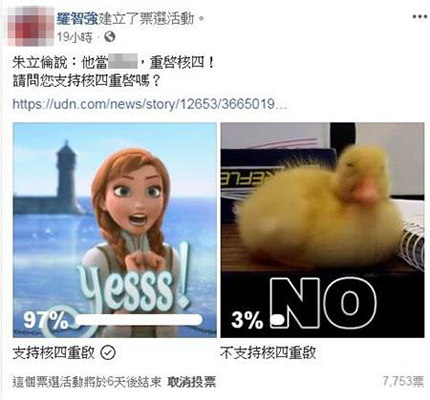 臺北市議員羅智強在臉譜網上辦投票問,請問您支持核四重啟嗎?不到24小時便有超過7700人投票,97%的投票民眾都支持重啟核四。(圖片取自臺媒)