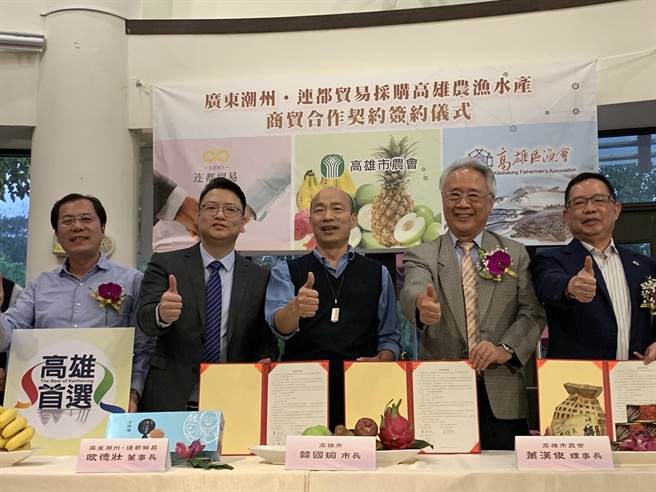 據報道,廣東潮州連都貿易公司董事長歐德壯昨晚在韓國瑜見證下,與高雄市農會理事長蕭漢俊及高雄區漁會理事長謝龍隱簽下1年采購10億新鮮農產品、農產加工品及漁產品的訂單,預計采購蓮霧、蜜棗、香蕉、芭樂、虱目魚、魷魚等產品。