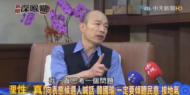 韓國瑜日前接受《新聞深喉嚨》專訪時,對于選不選2020,他語重心長表示“我怎么對高雄280萬市民交代?”他更表示,從未與吳敦義討論過征召問題。平秀琳問,若吳敦義口中的“萬分之一征召機會”真的發生了,那你是否有想過要怎么回應,回應高雄市民、回應全臺民眾?