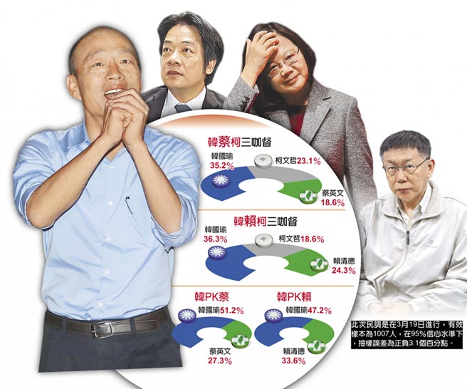 更甚者,若賽局換成“蔡vs.韓”兩強對決,蔡的支持度僅27.3%,韓國瑜則是拿下51.2%的過半支持。另一方面,若民進黨陣前換將由賴上陣對上韓、柯,3人支持度依序為韓36.3%、賴24.3%、柯18.6%,由韓國瑜領先至少12個百分點。但國民黨若派朱立倫對上賴、柯,則會陷苦戰(zhàn),3人支持度依序為朱26.9%、柯23.8%、賴22.3%。