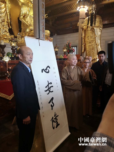 高雄市長韓國瑜27日一早赴廈門南普陀寺參拜,大陸佛教協(xié)會副會長則悟法師特贈一幅“心安事隆”墨寶。(中國臺灣網(wǎng)版權(quán)圖片)