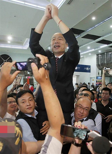 高雄市長(zhǎng)韓國(guó)瑜28日結(jié)束出訪抵達(dá)高雄小港機(jī)場(chǎng),受到萬(wàn)名“韓粉”、民眾熱情接機(jī),韓國(guó)瑜為向在場(chǎng)所有人揮手致意,身旁2名隨扈把他高高舉起。(圖片來(lái)源:臺(tái)灣“中時(shí)電子報(bào)”)