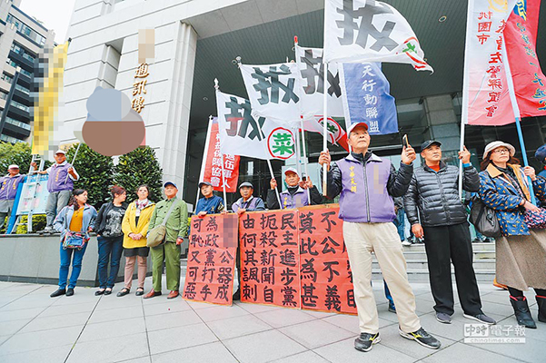藍(lán)天行動(dòng)聯(lián)盟、桃園市基層佐警聯(lián)誼會(huì)等團(tuán)體1日前往“NCC”,力挺“中天新聞臺(tái)”,控訴“NCC”對(duì)中天裁罰是箝制新聞自由。(圖片來源:臺(tái)灣“中時(shí)電子報(bào)”)