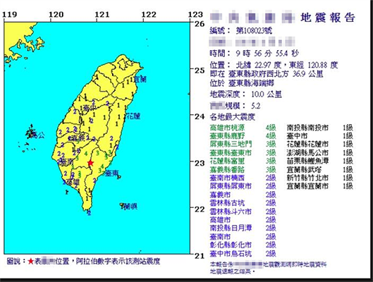 臺東今天上午9點56分發生里氏規模5.2級地震,震中在臺東縣政府西北方36.9公里,震源深度10公里。(圖片取自臺媒)