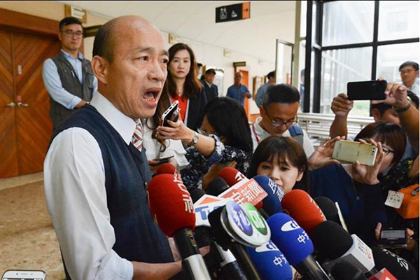 高雄市長韓國瑜1日到高雄市議會進行施政報告,休息時接受媒體采訪。(圖片來源:臺灣“中時電子報”)