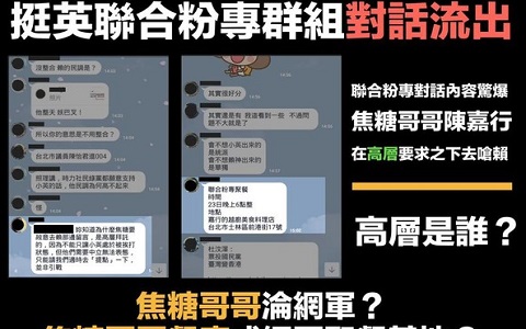 中國臺灣網4月4日訊 據臺灣“東森新聞云”報道,粉絲專頁“清出于南”日前貼出一張挺英聯合粉絲專頁的Line群組對話,指出藝人焦糖哥哥陳嘉行接獲“高層”指示,授意他到賴清德臉書留言質疑賴清德,引發網友諸多討論,“對話中的高層是誰?”