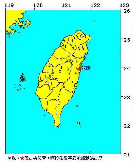 據臺“氣象局”地震報告顯示,今日凌晨4:24吉安鄉再度發生4.7級有感地震,深度達11.1公里,花蓮最大震度同樣達5級,南投、臺中3級,宜蘭、彰化2級,臺東、桃園、云林、嘉義、新竹、新北1級。