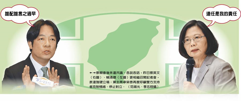 蔡賴會后未達(dá)共識、各說各話,昨日蔡英文(右圖)、賴清德(左圖)更相繼召開記者會,表達(dá)強(qiáng)硬立場。(圖片來源:臺灣“中時電子報”)