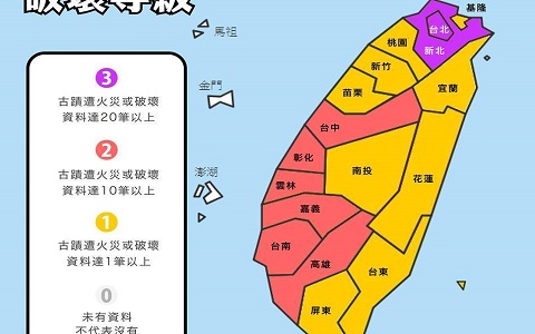 “古跡破壞制縣等級圖”開發程度越高的城市毀壞等級也越高,其中以臺北市、新北市最為嚴重。(圖片來自臺媒)