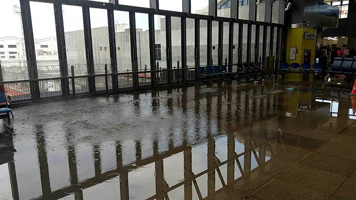 受到強震影響,花蓮火車站三樓水管嚴重破裂,候車區成為水池。(圖片來源:臺灣“中時電子報”)