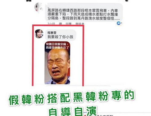 游淑慧說,看到臉譜網名為“程惠雯”的賬號到處留言酸高雄市長韓國瑜,到底是假韓粉、搭配“黑韓粉專”自導自演,還是單純不理性反韓者的暴力留言?大家來公斷。