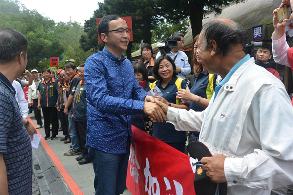 有意爭取2020提名的前新北市長朱立倫10日到苗栗參訪,與支持者握手寒暄。(圖片來源:臺灣“中時電子報”)