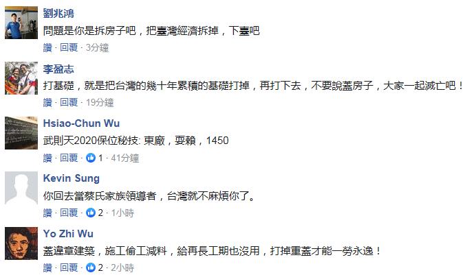 不過臺灣網友對此并不買賬。有網友表示,蔡英文根本沒在蓋房子,而是在拆房子,把臺灣的經濟基礎都拆掉;也有網友批評,蔡蓋違章建筑,施工偷工減料,給再長工期也沒用,打掉重蓋才能一勞永逸!(中國臺灣網 高旭)