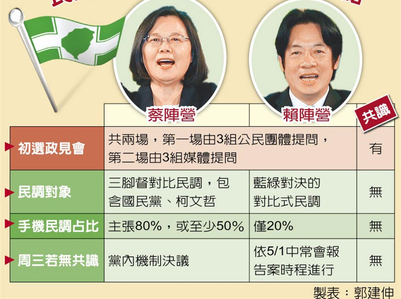 報道指出,雖然雙方愿意就未達共識部分繼續努力,不過若明天中午12點前沒有最后共識,民調究竟要排在何時?賴陣營主張依5月1日中常會報告案時程進行,蔡陣營則主張依黨內機制決議進行,仍舊未有結論。