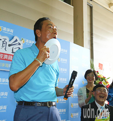 鴻海董事長郭臺銘(左)上午到桃園市參訪清凈海生技公司,試用清凈海的環(huán)保產(chǎn)品洗盤子,大贊清凈海對環(huán)境的用心,還用舌頭舔盤子為清潔劑安全掛保證。(圖片來源:臺灣《聯(lián)合報》)
