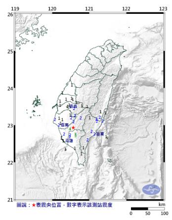 臺當局“中央氣象局”表示,高雄市美濃區晚間11點53分發生規模4.6級地震,深度12.8公里,震中位在高雄市府東北方43.4公里,震度最大4級在旗山。其余各地震度分別為屏東縣三地門3級,臺南市、屏東市、嘉義縣大埔、臺東縣、花蓮縣富里2級,連遠在彰化及南投縣也有1級。
