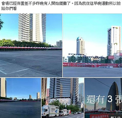 網(wǎng)友發(fā)文,韓國瑜臺(tái)中造勢(shì)會(huì)場(chǎng)已經(jīng)布置差不多,昨晚有人開始擺攤了。(圖片取自臺(tái)媒)