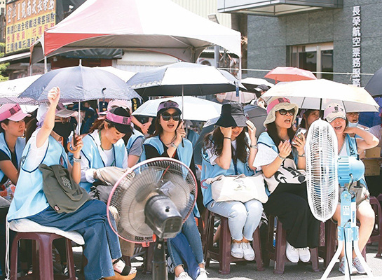 臺灣長榮空乘人員昨第二天罷工,空乘人員頂著大太陽,持續在長榮南崁航運大樓前靜坐抗議,為避免中暑,一旁架設電風扇降溫。(圖片來源:臺灣《聯合報》)
