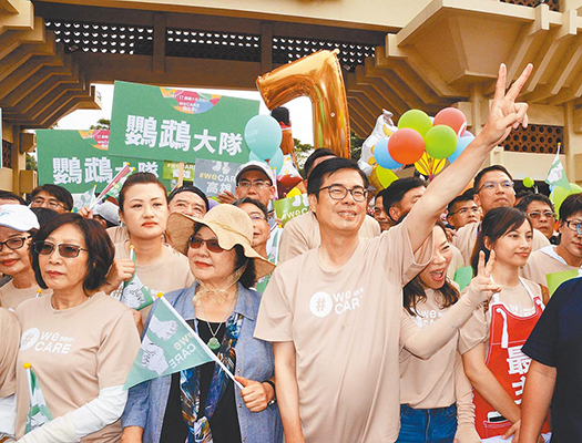 “花媽”人馬高雄市前文化局長尹立,在去年市長選舉前辭官轉投臺灣社團“Wecare高雄”,以民間團體之姿替陳其邁輔選,圖為去年11月17日舉辦熱氣球游行活動,當時市長候選人陳其邁(前排中)、陳菊(前排左二)等人均參加。(圖片來源:臺灣“中時電子報”)