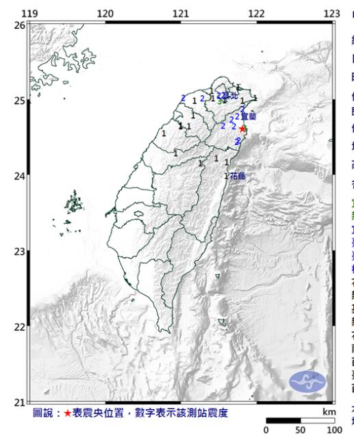 然而,這起地震后,早晨7時02分左右,宜蘭蘇澳又發生4.6級地震,震中位于宜蘭縣政府南偏東方14.8公里,地震深度為66.4公里。各地最大震度宜蘭縣蘇澳、新北市新店3級。臺北、桃園2級。花蓮、基隆、新竹、南投、苗栗、臺中1級。(中國臺灣網 李寧)