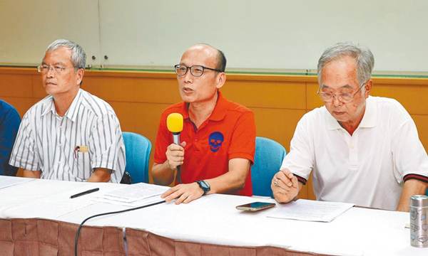 30日,嘉義大學歷史系教授吳昆財(中)主持記者會,表示高一新生要用的新教科書有多處刻意“去中國化”,不符合真實的歷史。(圖片來源:臺灣《中國時報》)
