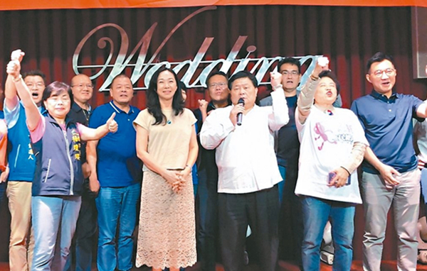 挺韓的鎮(zhèn)瀾宮董事長顏清標(右三)向郭臺銘、王金平喊話。(圖片來源:臺灣《聯(lián)合報》)