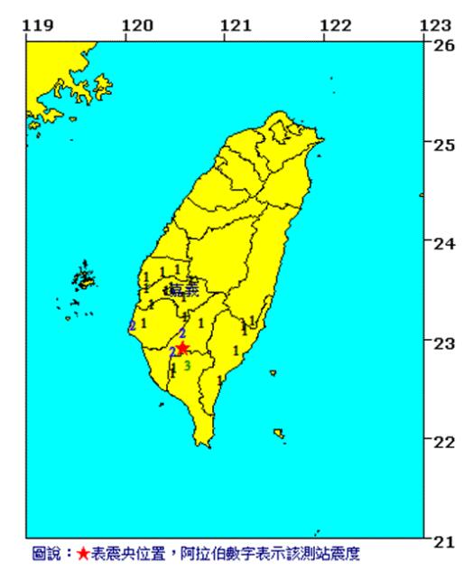 最后,02時42分高雄又有地震,震中同樣在高雄市政府東北方43.2公里,位于高雄市六龜區,地震規模4.2級,最大震度屏東縣3級;高雄市、臺南市2級;嘉義縣、臺東縣、嘉義市、云林縣、花蓮縣1級。(中國臺灣網 李寧)