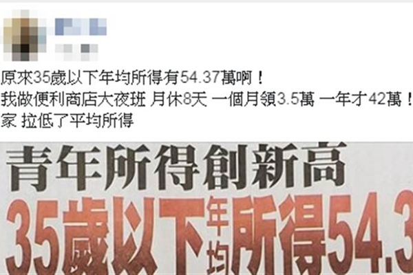 有網友轉發新聞,說“原來35歲以下年均所得有54.37萬啊!我做便利商店大夜班,月休8天,一個月領3.5萬,一年才42萬!我對不起大家,拉低了平均所得。”