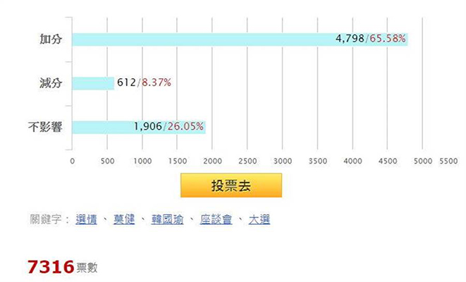 截至今日中午12點,參與投票者達7316人,認為韓國瑜不訪美對選情是加分的網友有4798個,占比達65.58%。(圖片來源:臺灣“中時電子報”)
