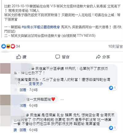 但有網(wǎng)友在臉譜網(wǎng)(facebook)上比較兩場(chǎng)造勢(shì)活動(dòng),發(fā)現(xiàn)“蔡英文的場(chǎng)子顯然感受不到民眾熱情?只聽到她一人在念經(jīng)!司儀在臺(tái)上喊:等下領(lǐng)便當(dāng)”,但在韓國(guó)瑜的場(chǎng)子,卻是充滿歡熱洋溢的氣息!底下網(wǎng)友也紛紛表示,“唯一支持韓國(guó)瑜”“有眼睛的人都看的出來”!(中國(guó)臺(tái)灣網(wǎng) 賈若瀾)
