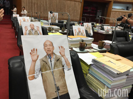 由于高雄市長韓國瑜請假,民進黨議員上午在議事廳門口和每位民進黨籍議員的座位上放著韓國瑜人形立牌。(圖片來源:臺灣“聯合新聞網”)