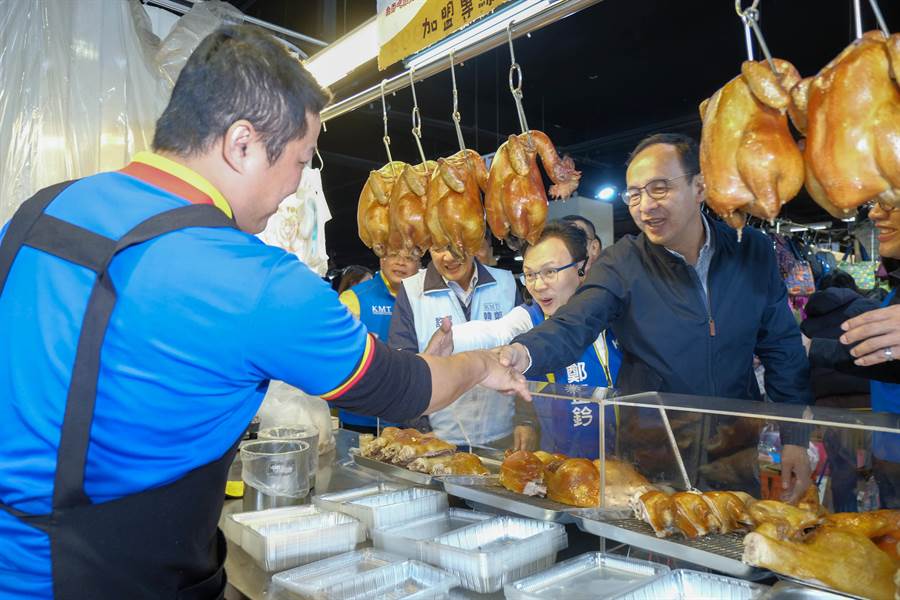 前新北市長朱立倫(右)陪同“立委”參選人鄭正鈐(左)在竹蓮市場拜票,向攤商握手懇托支持韓國瑜。(圖片來源:臺(tái)灣“中時(shí)電子報(bào)”)