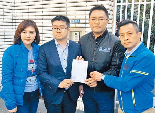 國民黨臺北市議員李明賢(右起)、張斯綱、徐弘庭及王欣儀等人,4日來到臺當局“駐日代表處”遞交陳情書,要求“駐日代表”謝長廷說清楚。(圖片來源:臺灣“中時電子報”)