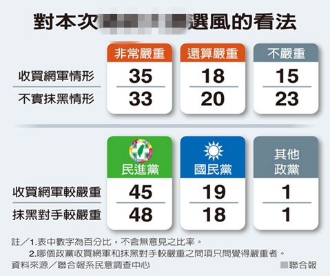 臺(tái)灣《聯(lián)合報(bào)》進(jìn)一步分析發(fā)現(xiàn),在“蔡賴配”支持者中,各有近20%認(rèn)為民進(jìn)黨在收買網(wǎng)軍及抹黑對(duì)手上操作負(fù)面選舉的情況更嚴(yán)重。