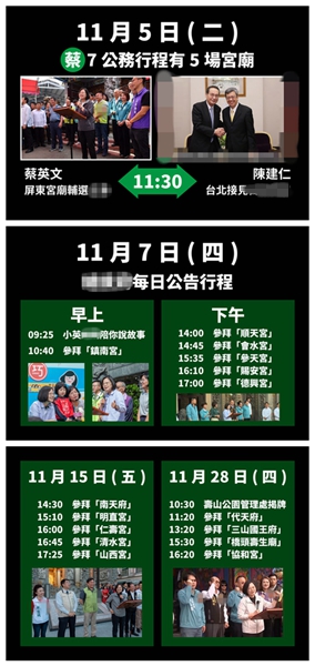 韓國瑜競選辦公室發(fā)言人鄭照新舉例,11月5日星期二,當天蔡英文早上到屏東宮廟輔選“立委”,同時竟交由臺灣地區(qū)副領導人陳建仁在臺北接見賓客;11月7日星期四,蔡英文下午前往云林宮廟輔選“立委”,同時間竟交由陳建仁臺北接見“大愛獎”得主等。
