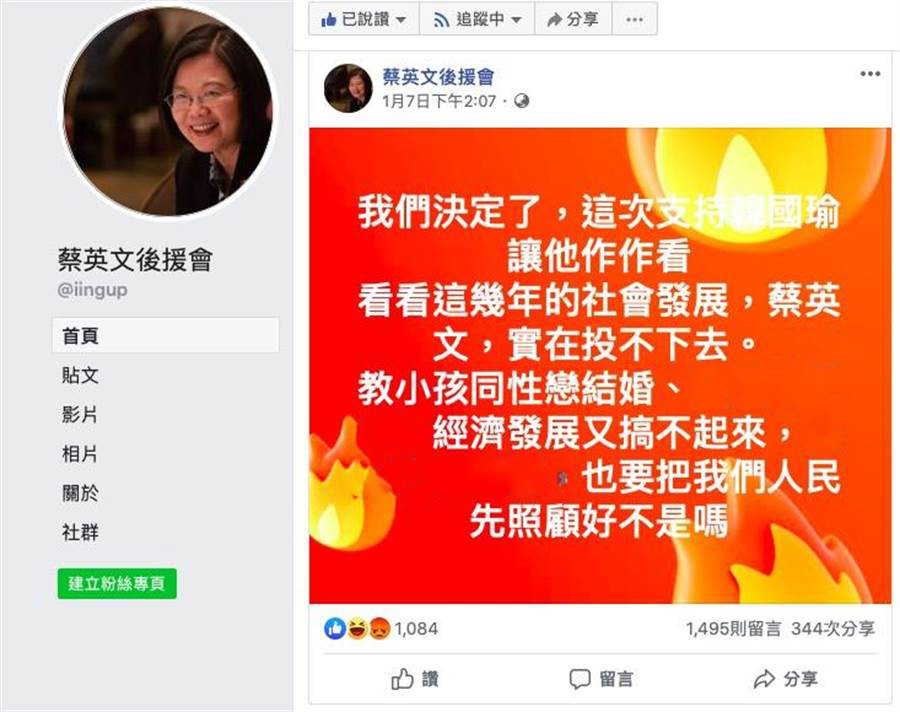 倒戈了!經營4年“蔡英文后援會”粉專竟改挺韓國瑜
