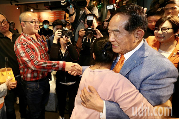 宋楚瑜(右二)與副手人選余湘(右一)在晚上在競選總部發表感想。隨后離開總部時一一向支持者握手、擁抱謝票。(圖片來源:臺灣《聯合報》)