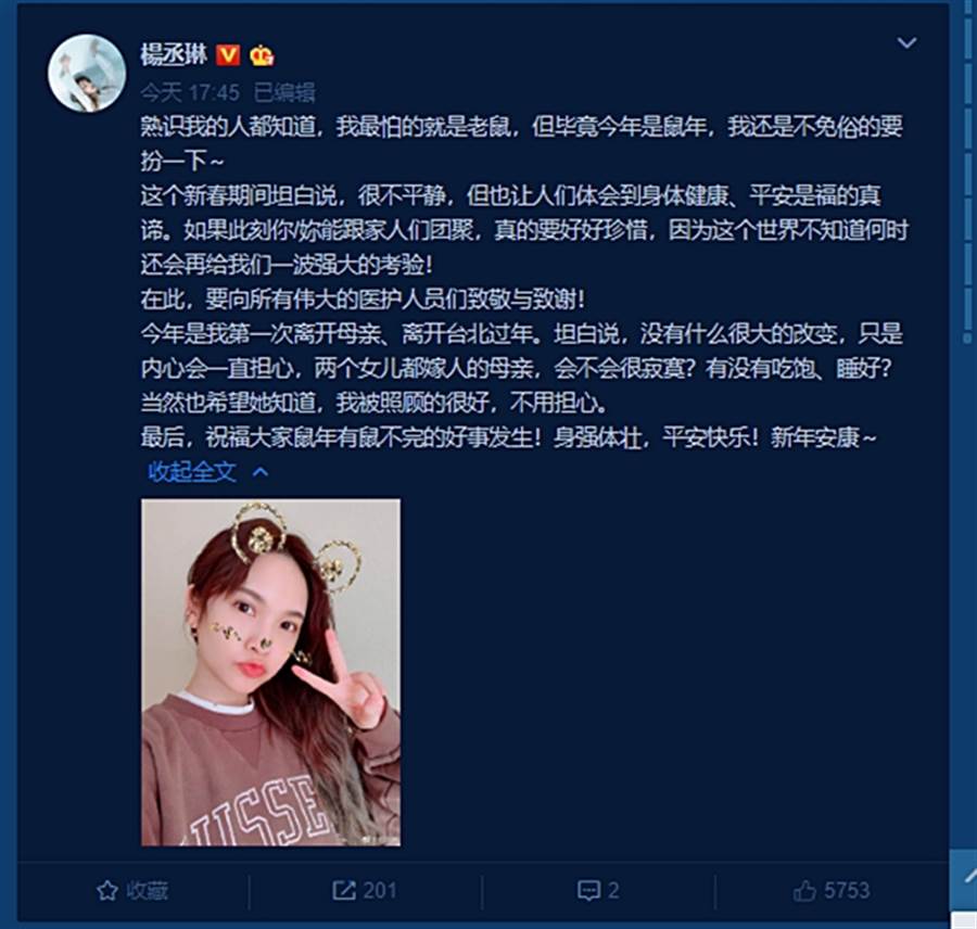 中國(guó)臺(tái)灣網(wǎng)1月26日訊 35歲楊丞琳和34歲李榮浩交往5年,去年9月戀情開花結(jié)果領(lǐng)證結(jié)婚,今年農(nóng)歷新年是楊丞琳升格人妻的第一個(gè)新年,也是她第一次不在臺(tái)北過節(jié),她昨天(25日)下午發(fā)文分享心情,知道母親會(huì)擔(dān)心她,她孝順地說(shuō):“希望她知道,我被照顧得很好,不用擔(dān)心”。