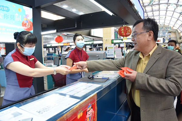 澎湖縣長賴峰偉視察澎湖機場運輸情況,發紅包感謝值班人員辛苦。(圖片取自臺媒)