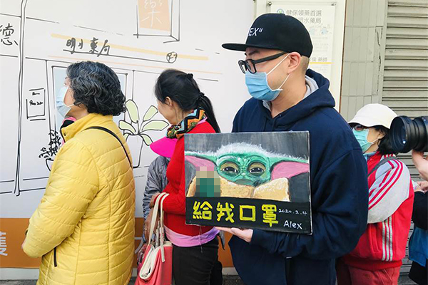 中國臺(tái)灣網(wǎng)2月6日訊 據(jù)臺(tái)灣“中時(shí)電子報(bào)”報(bào)道,臺(tái)當(dāng)局推行的口罩實(shí)名限購措施6日起實(shí)施,許多民眾一早便持健?ㄅ抨(duì)購買。有排隊(duì)民眾自行繪制影視作品《星球大戰(zhàn)》中“尤達(dá)大師”的形象暗諷蔡英文,并在畫作上寫著“給我口罩!”暗嗆臺(tái)當(dāng)局。