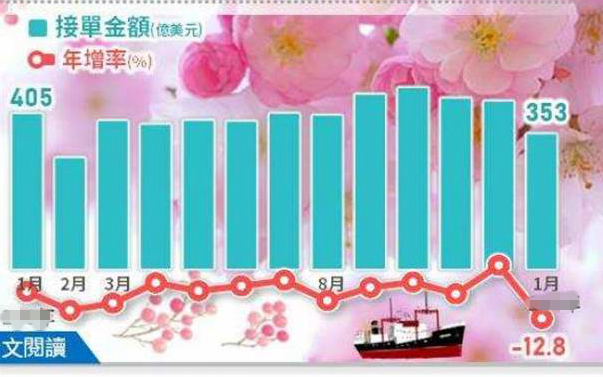 臺(tái)灣地區(qū)1月份外銷訂單金額統(tǒng)計(jì)為353.1億美元,7大類項(xiàng)目訂單受到產(chǎn)業(yè)淡季及及春節(jié)因素,金額全面減少。(圖片取自臺(tái)媒)